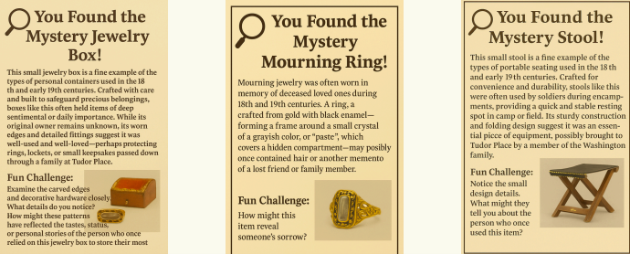 Time Traveling with Tudor Place is an interactive scavenger hunt through the Tudor Place gardens, inviting children and visitors of all ages to explore and discover how this historic site connects to America’s broader story. Using objects once featured in the Tudor Place estate sale, the experience transforms these items into discovery points across the grounds. Through clues and hands-on exploration, participants will uncover the objects from the estate sale which will bring the past to life in a fun and meaningful way.