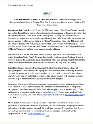 The Founding Fortunes Exhibit Launches in 2026 for Tudor Place 250 WASHINGTON, D.C. - Tudor Place is launching a new exhibit in 2026, “Founding Fortunes,” to celebrate America’s 250th anniversary. “Founding Fortunes” will display artifacts from the Peter family, descendants of Martha Washington, while also showing the impact of how race, class, freedom, and gender have shaped the estate and the nation. This exhibit plans to examine the Mount Vernon sales of Martha Washington’s possessions in 1802. Some of her possessions included furniture, tea chests, and artwork. The initial sale total was $3,735 (worth $113,000+ today).